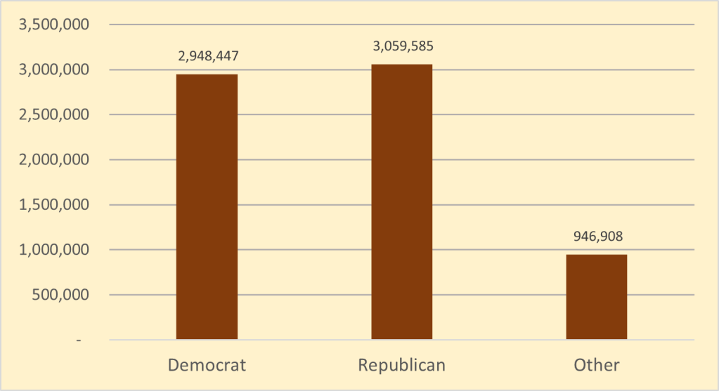 In 2024, Trump prevailed over Harris by 120,000 votes, from which we can deduce that he netted some 70,000 votes from cross-over Democrats and independent voters. However, these should be considered swing voters who might readily reverse course in the next election.