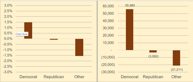 Going into the November 2020 election, the Democrats had enjoyed an advantage of 686,000 more registered voters compared to the Republicans (rounding to the nearest 1,000). Because of each party’s gains and losses over the interim period, as of November 2024, the Democrats’ registered voter advantage had fallen to 286,000.