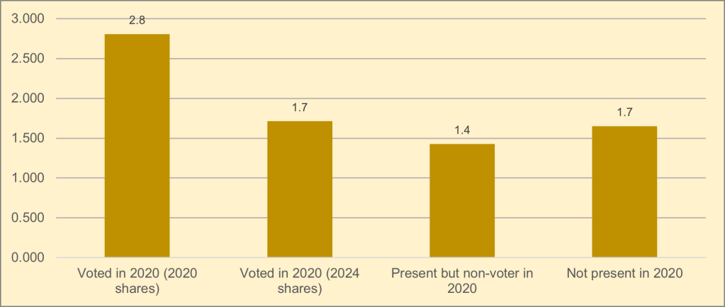 The third bar shows the ratio of Democrat to Republican mail-in ballot shares in 2024 for participants in 2024 who were present but did not vote in 2020. The final bar shows the ratio of Democrat to Republican mail-in ballot shares in 2024 for participants in 2024 who were not present in 2020.