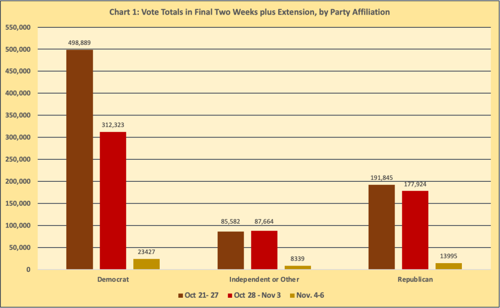 Also in Table 1, we see that turnout was lower than predicted among unaffiliated voters. The realized turnout rate for this cohort was 63.2 percent, lower than their predicted 65.4 percent, with actual turnout falling short by about 45,000 voters.