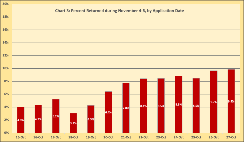 Chart 2 similarly shows that active, primary non-participants in 2024 who had been registered but did not vote in 2020 had weaker 2024 turnout than those voting at the polls in 2020, relative to what the model had projected. Again, this was the case within each party affiliation category.