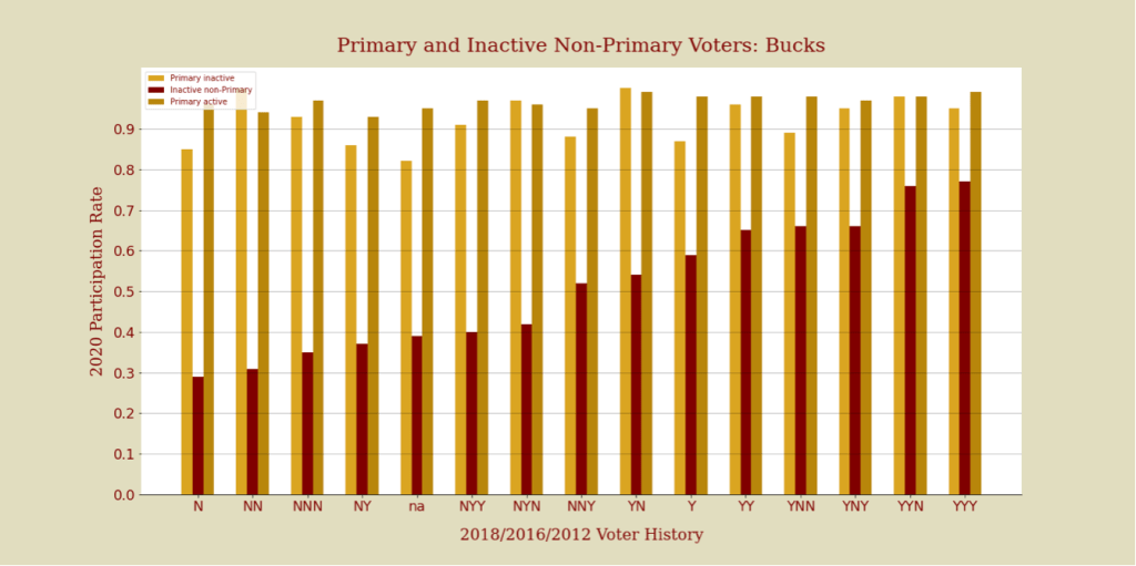 Figure 1 illustrates the turnout model for three segments of Republican voters in Bucks County. The three segments are based on activity status as indicated in their voter registration record and by whether they participated in the 2020 primary election.3